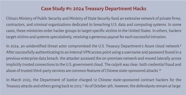 [52] Dustin Volz, “In Secret Meeting, China Acknowledged Role in U.S. Infrastructure Hacks,” Wall Street Journal, April 10, 2025, https://www.wsj.com/politics/national-security/in-secret-meeting-china-acknowledged-role-in-u-s-infrastructure-hacks-c5ab37cb.