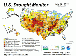 According to the July 10 release of the National Drought Monitor from the National Oceanic and Atmospheric Administration and the National Drought Mitigation Center, roughly 61% of the contiguous United States is in drought. The only areas that are completely drought-free are Alaska and the New England states. The extreme heat wave in June and July, coupled with decreased rainfall, has had devastating effects on our nation’s corn crops. This drought has hit farmers and ranchers hard, and is likely to inflate food prices, even if the droughts ended today.